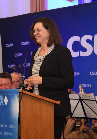 Mit der Bayerischen Staatsministerin für Wirtschaft und Medien, Energie und Technologie Ilse Aigner, Stellvertreterin des Bayer. Ministerpräsidenten, konnte Ortsvorsitzende Rosemarie Haag eine hochkarätige Festrednerin in Rennertshofen begrüßen. Schon vor Beginn der Veranstaltung in der Musikmanege wurde die Ministerin im Hof von Demonstranten gegen die Stromtrasse empfangen. Im Verlauf ihrer Ausführungen brachte Aigner ihr Verständnis für deren Belange zur Sprache und formulierte die derzeitige CSU Linie, wonach zuerst überprüft werden müsse, "ob wir die Stromtrasse überhaupt brauchen."